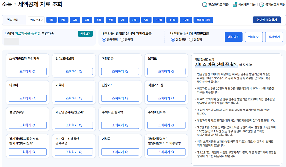그렇게 인증을 마치고 나면 첨부한 사진에서 볼 수 있듯이 나와 나에게 자료제공을 동의한 보양가족의 정보를 토대로 연말정산에 필요한 자료를 추출할 수 있다. 따로 하나하나 클릭할 필요 없이 한번에 조회하기 버튼을 누르면 일괄적으로 조회가 이루어지고, 그렇게 조회를 마친 자료는 '내려받기'를 통해 다운로드할 수 있다.