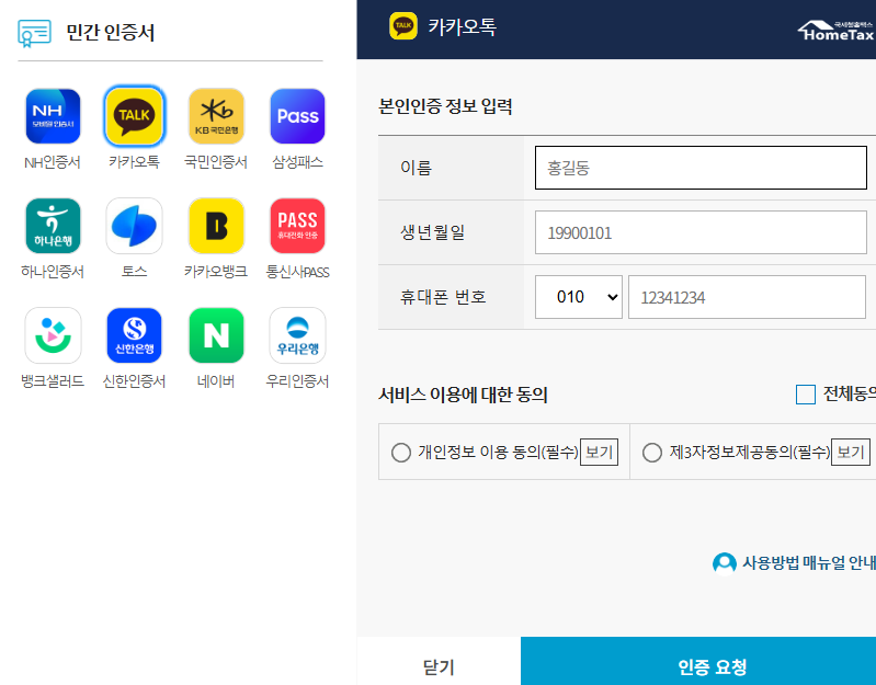 해당 서비스를 이용하기 위해서는 기본적으로 성명과 주민등록번호를 입력한 이후 인증 과정이 필요하다. 처음에는 홈페이지가 너무 허름해(?) 보여서 피싱 사이트인가 의심할 수도 있지만, 홈택스 홈페이지를 사칭하여 개인정보를 탈취하려는 대범한 사람은 아무리 한국이라도? 없을 것으로 생각한다.