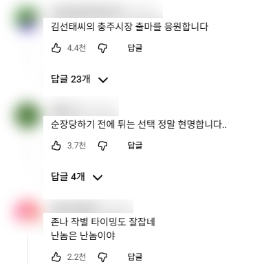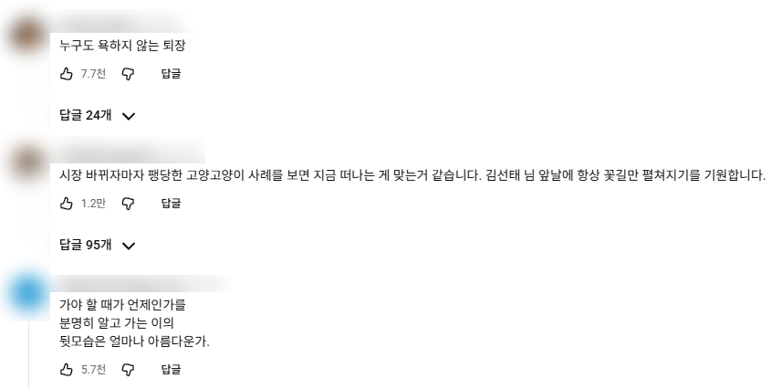 충주맨 김선태가 오늘 업로드한 작별 인사 영상 댓글을 본다면 '누구도 욕하지 않는 퇴장', '지금 떠나는 게 맞는 것 같습니다', '가야 할 때가 언제인가를 분명히 알고 가는 이의 뒷모습은 얼마나 아름다운가.'라며 우리에게 교과서 시로 익숙한 이형기의 시 낙화를 적은 구독자도 있었다. 모두가 그를 응원하는 아름다운 퇴장이었다.