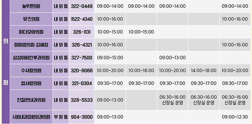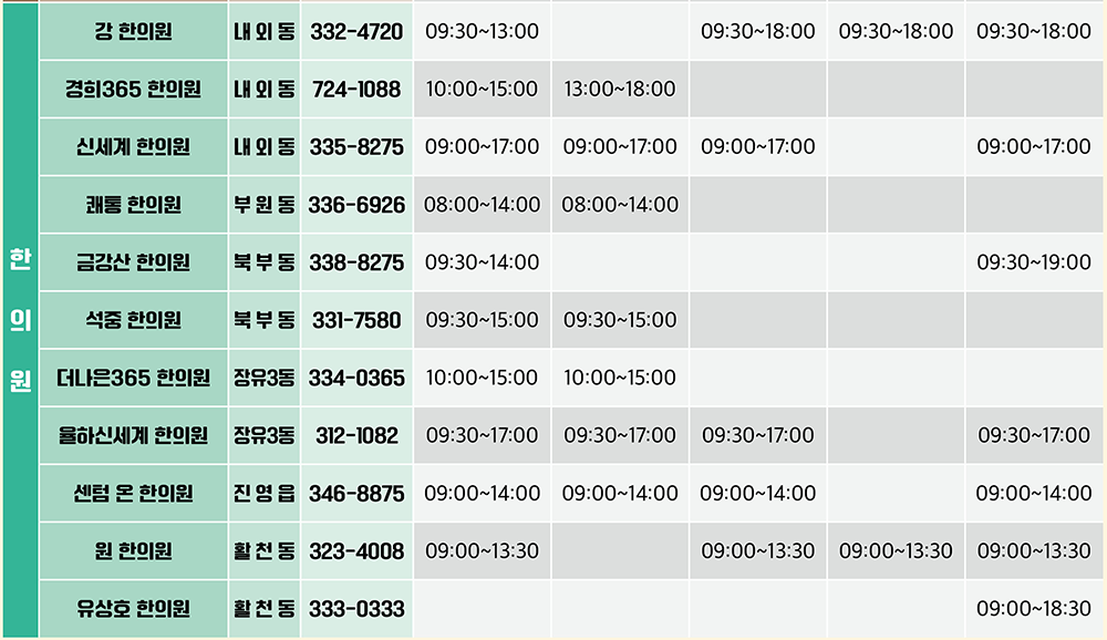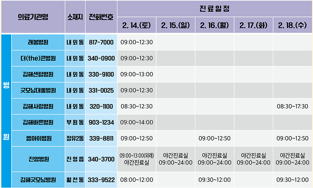 대표적으로 우리가 연 휴기간 동안 찾기 마련인 병원과 한의원만을 정리해서 업로드를 해보았다. 이미지를 보면 알 수 있듯이 병원은 대체로 14일(토) 점심시간까지만 운영하는 경우가 많았고, 진영 병원만이 설 연휴 기간에도 야간 진료실을 아침 9시부터 밤 24시까지 운영을 하고 있으니 참고할 수 있도록 하자.