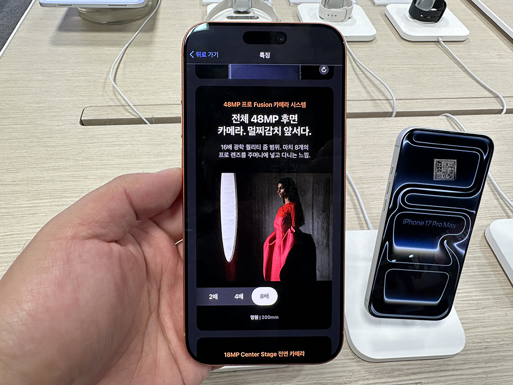 나는 아이폰 14 프로를 사용하면서 아직까지 불편함을 느낀 적이 없기 때문에 굳이 업그레이드를 하지 않아도 될 것 같았다. 하지만 하나 유일한 아쉬움이 있다면 바로 카메라다. 아이폰 14 프로는 최대 광학줌이 3배까지만 지원이 되지만, 아이폰 17 프로는 첨부한 사진에서 볼 수 있듯이 8배 줌을 지원하고 있어 촬영이 굉장히 편리하다.