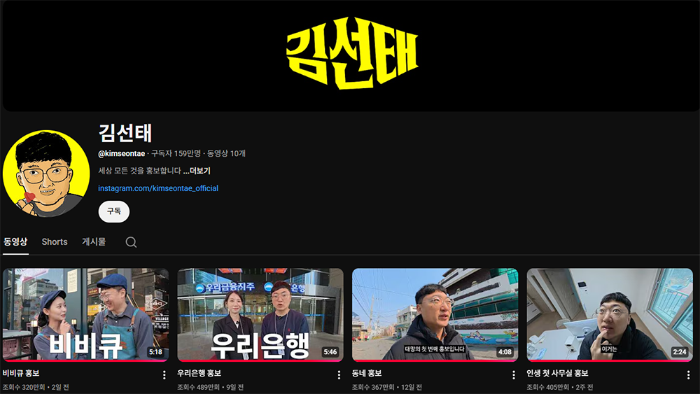 동네 홍보 영상이 367만 회, 우리은행 홍보 영상이 489만 회, 비비큐 홍보가 320만 회인 지금의 모습을 얼마나 잘 유지할 수 있는지가 관건이라고 생각한다. 보통 혼자서 기획하고, 편집할 경우에는 트렌드 변화에 따라가지 못해 나처럼 블로그나 SNS 채널이 주저앉는 경우도 쉽게 볼 수 있다. 하지만 김선태는 조금 다르다.