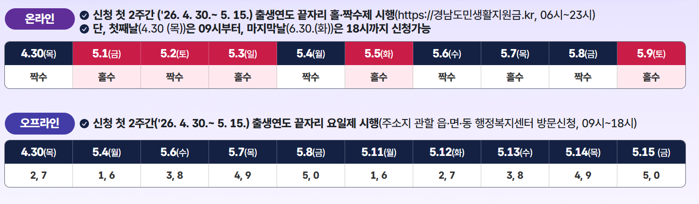 이번 경남 생활 지원금 신청은 만 19세 이상일 경우 개인 신청이 원칙으로, 미성년자는 세대주가 대신 신청해야 한다. 단, 세대 내 성인이 없는 미성년 세대주일 경우 직접 신청이 가능하다. 온라인 신청은 전용 사이트를 통해 오전 6시부터 밤 11시까지 신청할 수 있고, 오프라인 신청은 주소지 관한 읍·면 · 동 행정 복지센터를 방문하면 된다.