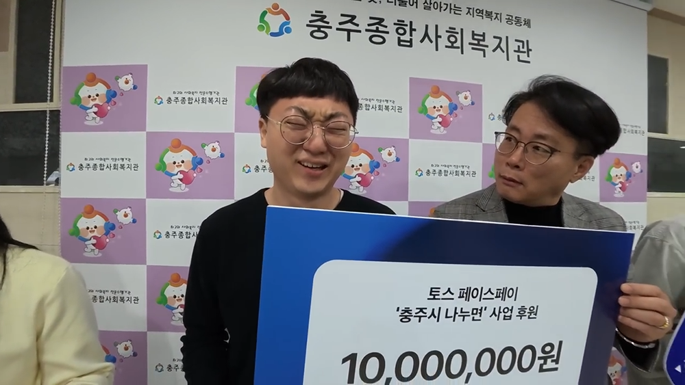 천만 원 쓰기 미션에 실패하면서 비록 그의 사비로 그가 쓴 금액을 지불해야 했지만 토스 측에 천만 원 기부를 제안하면서 충주 종합 사회 복지관에 천만 원을 함께 기부하게 되었다. 사진을 찍을 때 보여주는 특유의 그 표정까지 아주 완벽한 마무리였다고 생각한다. 사람들은 충주시에서 홍보하면서 충주에 기부까지 했다며 반응도 좋았다.