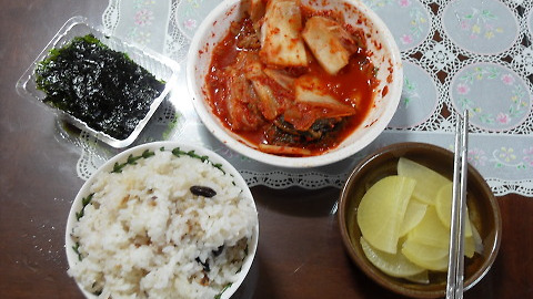 제가 항상 먹는 구성입니다. 가 주류이나, 요즘에는 스팸(햄)이 들어왔기 때문에 스팸과 단무지가 가끔 반찬에 오르기도 하지요. 작년 재수할 때 부터 대충 이런 식으로 먹어 온 것 같네요. ㅋ 식사란, 단지 몸에 필요한 영양을 보충하기 위한 행위일 뿐입니다. 거기서 뭘 거창하게 한다, 보기좋게 한다. 다 사치입니다. 수험생에게, 공부하는 학생에게, 그저 살아가는 사람으로써 식사는 몸에 필요한 영양보충이지 그 이상 그 이하의 어떤 의미도 존재하지 않습니다. 밥맛이 없다구요? 그저 꾸역꾸역 입으로 밀어 넣으면 되는 겁니다. 하지만, 가끔 색다른 것이나 맛있는 걸 먹고 싶은 욕구는 역시 주저할 수 없지요... 고등학교 졸업 후 안타까운게 한가지 있다면, 급식입니다. 급식 정말 맛있게 ..