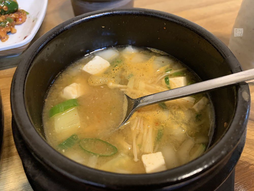 함께 먹을 수 있는 된장찌개 또한 비빔밥의 맛을 돋우는 역할을 톡톡히 하고 있다. 역시 한국 사람은 된장찌개에 밥 한 끼를 배부르게 먹어야 제대로 한 끼 식사를 했다는 느낌이지 않을까? 뭐, 어디까지 내가 그렇다는 거다. 나는 된장찌개 혹은 김치찌개와 밥 한 끼를 먹는 걸 무엇보다 좋아하기 때문에 항상 이런 형식의 구성을 선호한다.