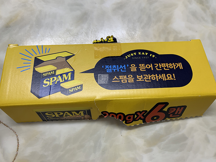 분명히 지난번 기사를 통해서 스팸의 플라스틱 뚜껑을 없앤다는 이야기를 문득 들었던 것 같은데 아직 이마트에서 판매되는 스팸에는 플라스틱 뚜껑이 있었다. 그리고 스팸이 들어가 있는 박스는 위 사진과 같은 형태로 스팸을 보관할 수 있는 용도로 활용할 수 있도록 만들어져 있어서 제법 이것도 마음에 들었다.