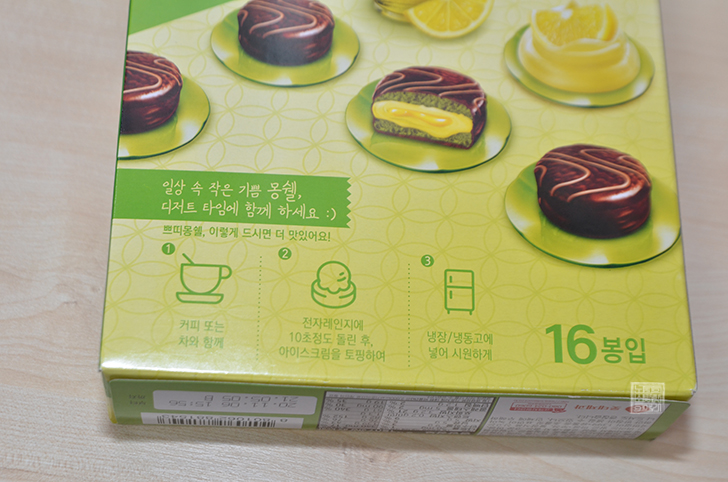 포장 상자만 아니라 낱개로 포장되어 있는 비닐 용지도 일반 몽쉘과 달리 레몬과 그린티가 섞여 있다는 걸 한눈에 알 수 있는 디자인이다. 포장 상자의 뒤를 본다면 '커피 또는 차와 함께' 혹은 '전자레인지에 10초 정도 돌린 후 아이스크림을 토핑 하여', '냉장/냉동고에 넣어 시원하게' 먹는 것을 추천하고 있다.