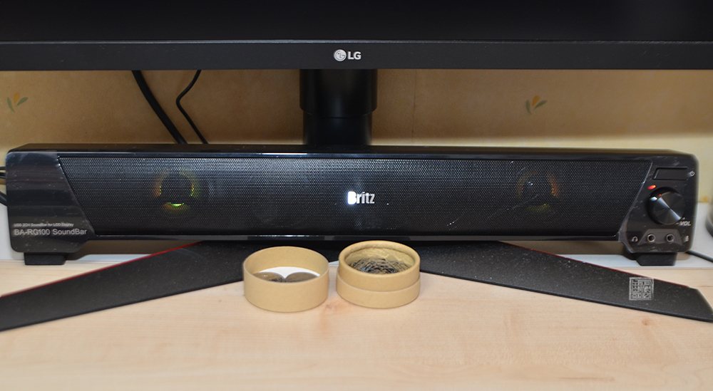 모니터의 내부 다리에 올려두면 처음에는 붕 뜬 느낌이었지만, 고무 받침대를 붙여서 올려두면 딱 다리가 제대로 사운드바 스피커 BA-RG100를 지지하고 있는 느낌이다. 이게 더 안정적이라고 보기가 좋았고, 검은색 모니터 테두리와 검은색 브리츠 사운드바 스피커 BA-RG100의 모습은 딱 일체되어 있는 느낌이라 좋았다.