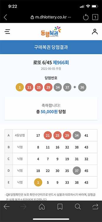 그런데 한 가지 아쉬운 점은 제966회 로또 당첨번호에 해당하는 1, 21, 25, 29, 34, 37이 모두 있었다는 점이다.