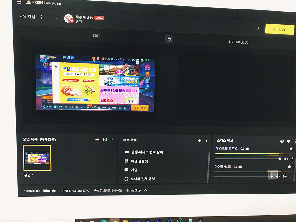 그리고 아이폰 hdmi 변환 어댑터에 hdmi 케이블을 연결하고, 해당 hdmi 케이블을 에이치디탑 hdmi 단자에 연결해 usb 3.0 단자 부분을 컴퓨터에 꽂으면 위 사진처럼 실시간 방송 라이브 스튜디오를 활용해서 방송 설정이 가능하다. 나 같은 경우에는 위 사진에서 볼 수 있는 프리즘 스튜디오를 이용해서 게임 라이브를 즐겼다.