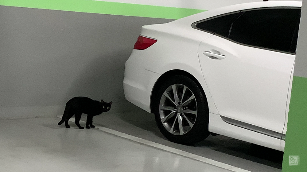 다른 한 마리는 내가 어머니로부터 전화를 받고 차에서 짐을 옮기기 위해서 아파트 지하 주차장에서 기다리고 있을 때 만났다. 어머니가 아직 도착하지 않아 스마트폰을 보면서 시간을 보내고 있었는데, 뭔가 기묘한 시선이 느껴져서 고개를 들어보니 왠 고양이 한 마리가 나를 지긋이 바라보고 있었다.