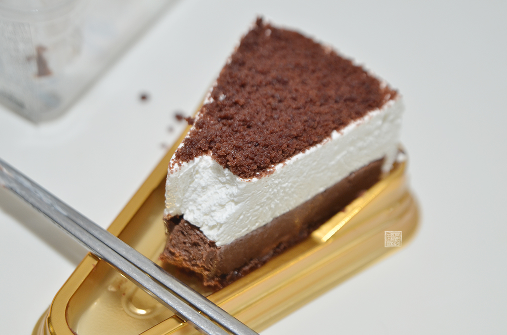 케이크의 모습을 본다면 크게 3층으로 나누어져 있다는 걸 알 수 있다. 가장 아래에는 초콜릿이 베이스로 되어 있는 빵?이 위치해 있고, 그 위에는 치즈로 구성된 층이 있어 치즈가 가지고 있는 느끼한 맛을 느낄 수가 있다. 그리고 가장 위에는 초콜릿 가루가 티라미수처럼 뿌려져 있어서 사실상 티라미수를 먹는 듯한 느낌도 있었다.