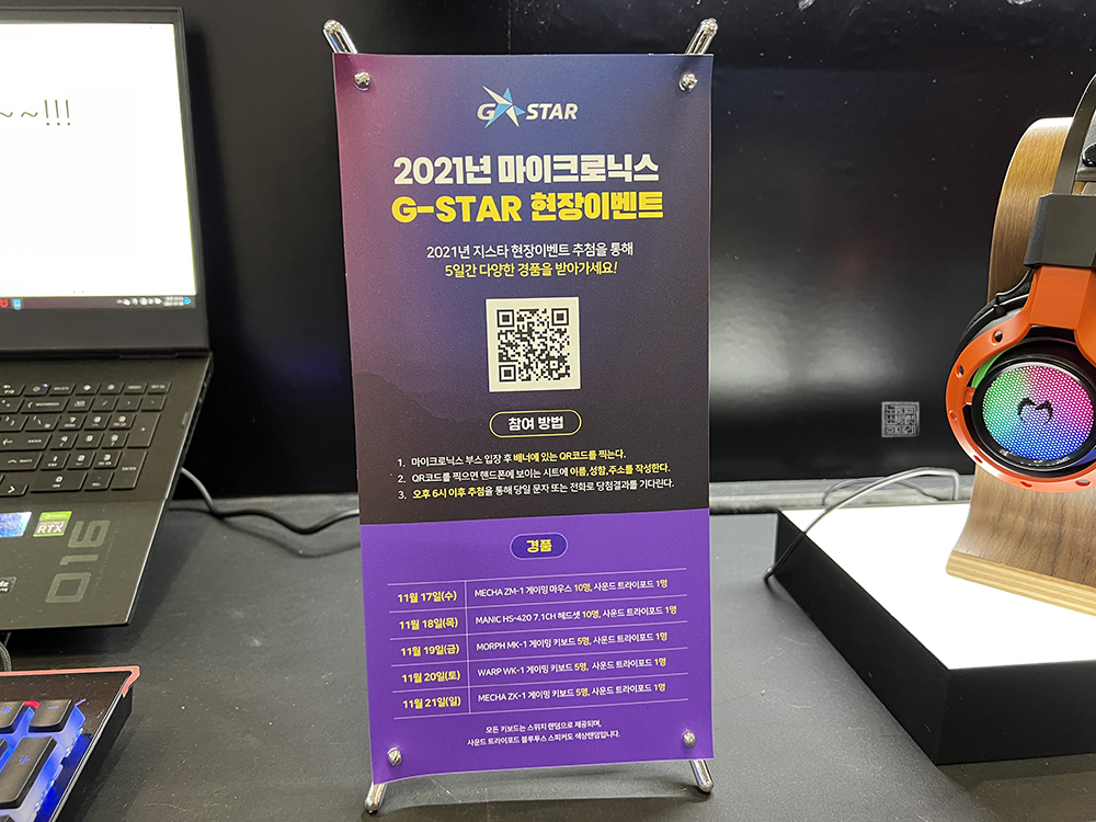 지스타 2021에서 참여할 수 있는 이벤트는 게임 시연 이벤트와 특정 장소를 방문하거나 인증샷을 찍어서 개인 SNS 채널에 올리는 미션 이벤트로 나누어져 있다. 나는 게임 시연 이벤트에 참여하기보다는 인증샷을 찍어서 올리는 이벤트와 함께 몇 부스에서 준비해놓은 QR 코드를 통해 접속할 수 있는 이벤트에 참여하는 것으로 만족했다.