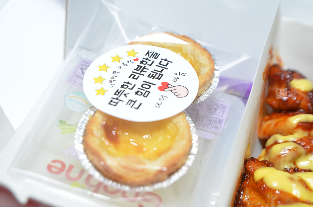 그때는 동봉된 치킨무를 먹거나 밥을 함께 먹어야 했다. 그리고 현재 굽네치킨에서는 리뷰 이벤트로 에그타르트를 2개 제공하고 있기 때문에 배달 어플로 주문할 때 '리뷰 이벤트 : 에그 타르트'를 작성한다면 에그타르트 2개를 받을 수 있다. 에그타르트와 함께 치킨을 먹는다는 게 살짝 낯설기는 해도 막상 먹어 보니 조합이 썩 괜찮았다.