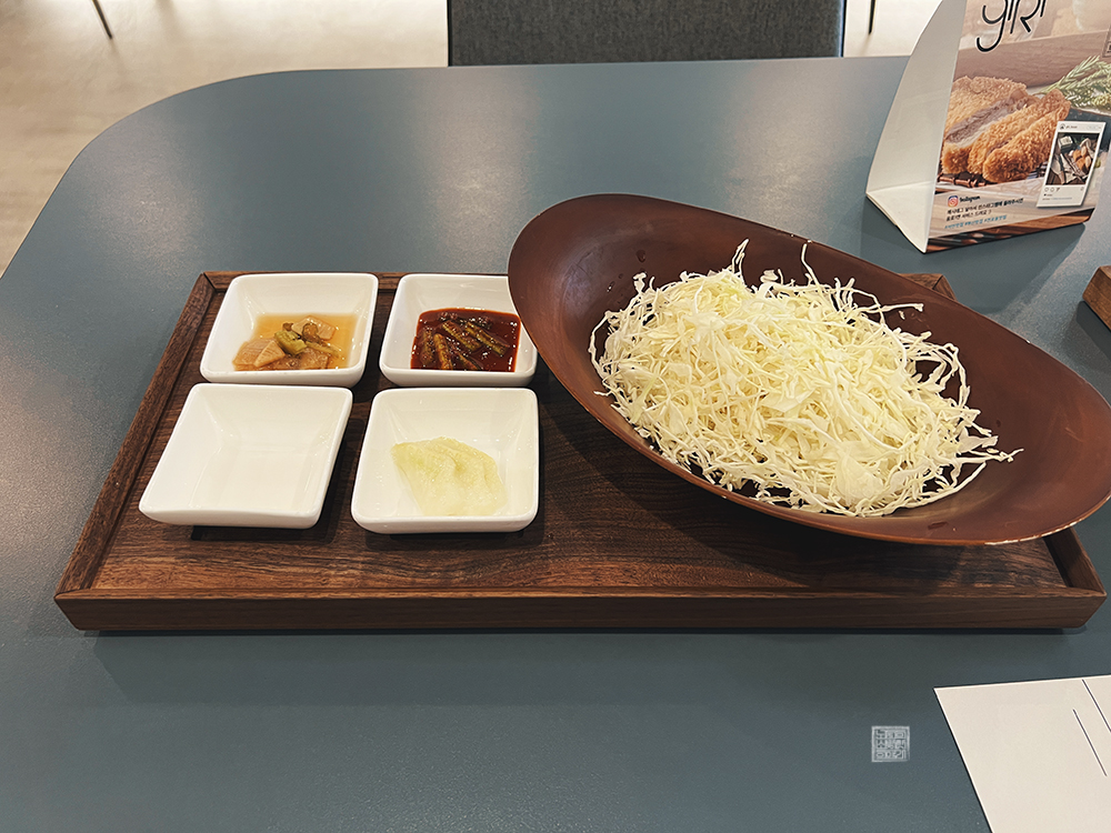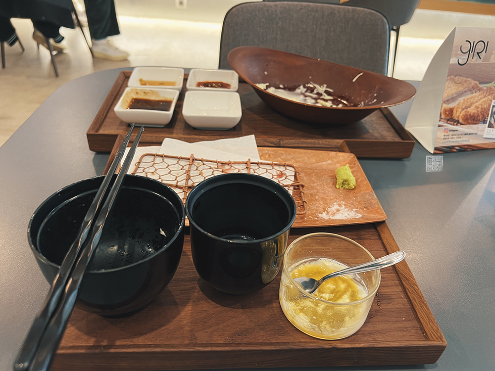 기리는 메뉴를 하나 주문하고 나면 항상 위 사진처럼 애피타이저로 먹을 수 있는, 혹은 차후에 메인 메뉴가 도착한다면 함께 먹을 수 있는 양배추 샐러드와 함께 정말 작게 담긴 밑반찬 세 가지를 받아볼 수 있다. 그리고 수저 세트는 테이블 옆에 달린 수저통을 열면 꺼낼 수 있는데… 개별 포장이 되지 않은 점은 아쉬웠다.