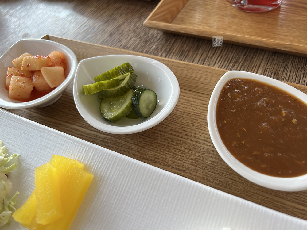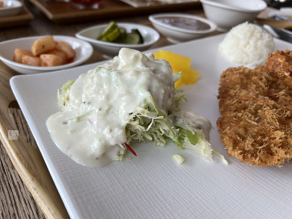 그리고 함께 받아볼 수 있었던 밑반찬이라고 말할 수 있는 샐러드와 깍두기, 피클, 소스 등도 나쁘지 않았다. 단, 함께 도착한 국물은 미소 된장국 같은 국물이 아니라 정체를 알 수 없는 맑은 국물이었는데, 해당 국물은 나와 취향이 너무 달라서 한번 숟가락으로 마셔본 이후 손을 대지 않았다. 역시 다 좋을 수는 없는 노릇이었다. (웃음)