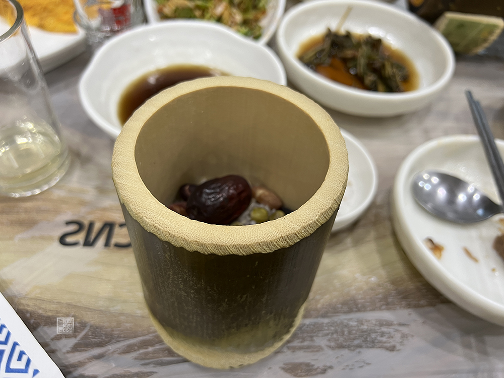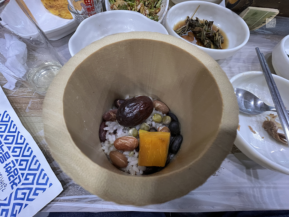 밥이 들어가 있는 대나무의 사이즈가 조금 큰 편이다 보니 밥이 많은 것 같기도 하고 적은 것 같기도 하지만, 일반적으로 우리가 가게에서 먹는 공깃밥보다 조금 더 양이 있었던 편이라고 생각한다. 그리고 위 사진을 보면 알 수 있듯이 평범한 흰쌀밥이 아니라 대추와 호박을 비롯한 다양한 견과류가 들어간 영양밥이었다.
