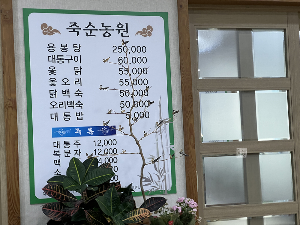 가게의 내부를 본다면 생각보다 규모가 크지 않다는 걸 알 수 있다. 이곳을 대표하는 메뉴인 대통구이는 준비하는 데에 약 2시간 정도의 시간이 걸리기 때문에 당일 방문해서 먹고자 한다면 최소한 2시간 이전에는 전화를 해서 사전 예약을 해두어야 한다고 한다. 그러니 차후 죽순농원을 찾고자 한다면 시간적 여유를 충분히 갖도록 하자.
