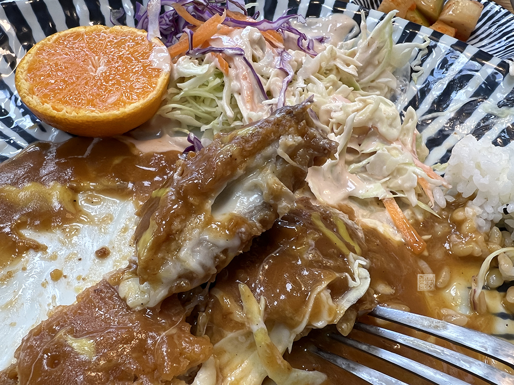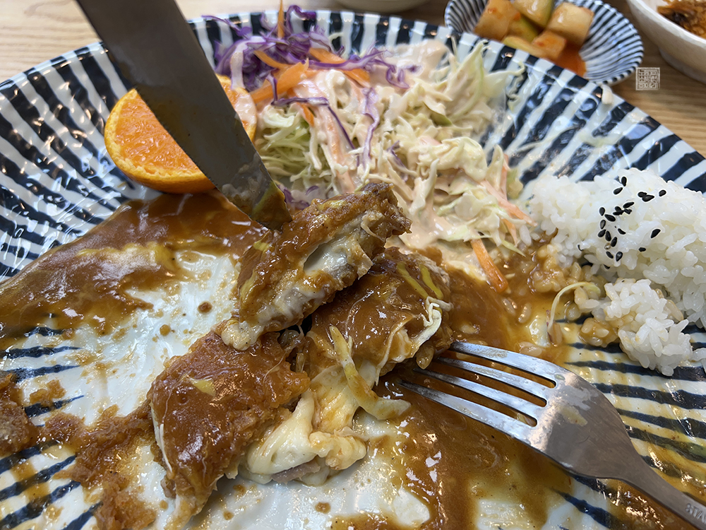 치즈가 겉으로 보이기 보다는 늘 돈가스 내부에 들어가 있기 때문에 돈가스를 자르기 직전까지 치즈가 얼마나 들어가 있는지 알 수 없고, 어릴 때 먹던 경양식 돈가스와 마찬가지로 소스가 이미 한가득 끼얹어진 돈가스는 바삭함보다는 부드럽게 먹을 수 있는 촉촉함이 있었다. 그리고 소스에 노란색 머스터드를 뿌리는 건 국룰이었다.