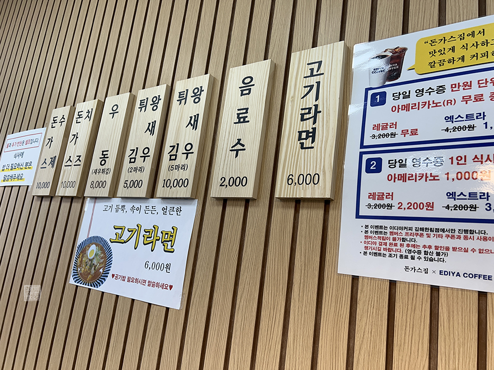 나와 어머니가 돈가스집에 들어갔을 때는 오후 1시 30분이 다 되어 가는 시간이라 사람은 그렇게 없었는데, 이름이 돈가스집이라고 해도 돈가스만 판매하는 건 아니었다. 해당 가게에서 판매하는 것은 수제 돈가스와 치즈 돈가스를 메인으로 해서 우동과 왕새우 튀김, 그리고 삼겹살을 토핑으로 올려서 나간다고 하는 고기 라면이 있었다.