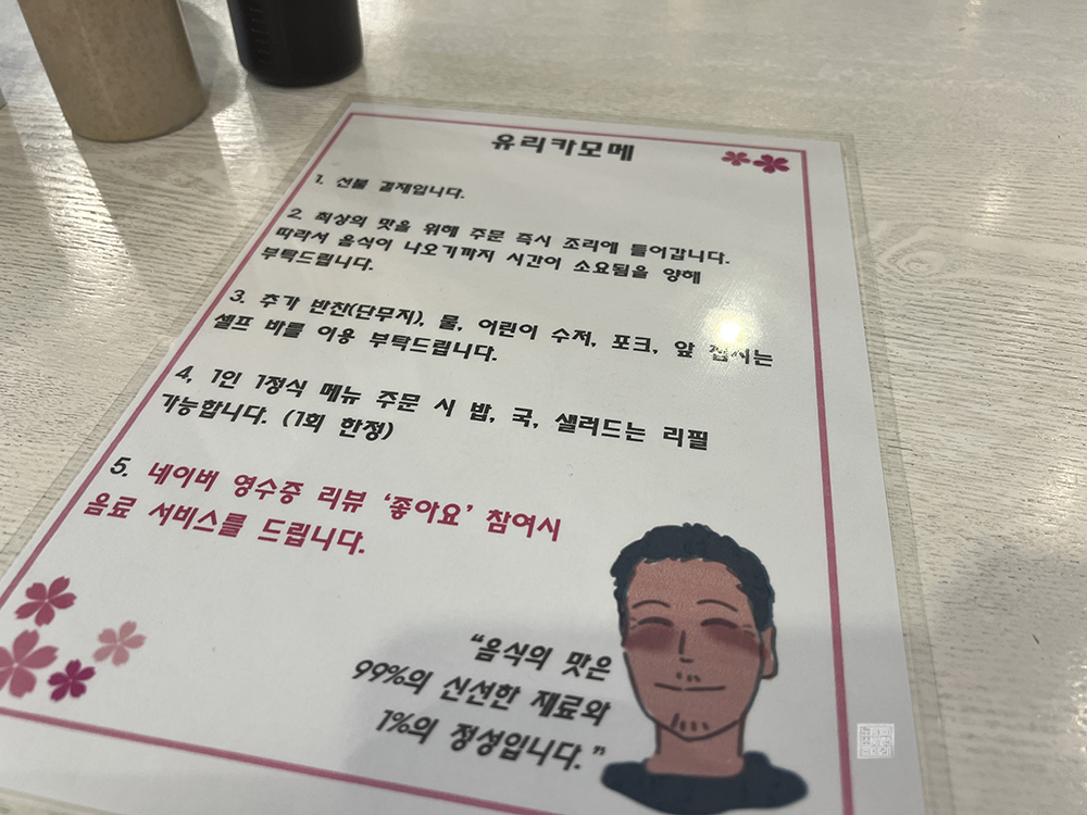 이곳의 메뉴판을 본다면 '1인 1메뉴 필수(어린이 포함)입니다'라고 적혀 있다. 아무래도 백화점에 위치한 가게이다 보니 종종 아이들을 데리고 쇼핑을 온 사람들이 메뉴 한두 개만 시켜놓고 자리를 차지하는 경우가 있어서 이런 규칙을 정해놓은 게 아닌가 싶었다. 특히, 주말에는 사람이 혼잡하기 마련이라 이런 사소한 규칙이 꼭 필요해 보였다.