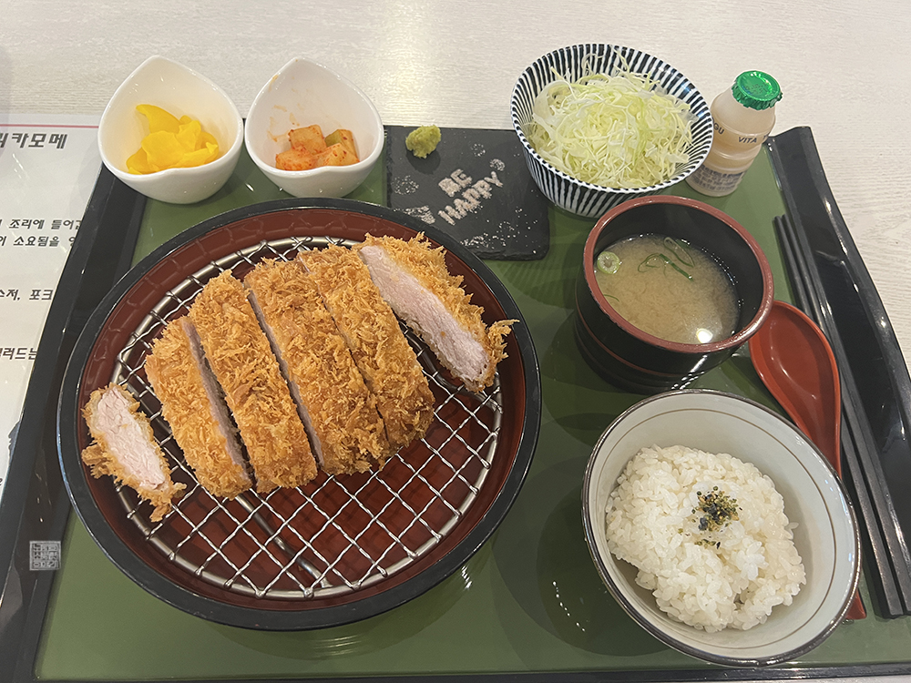 유리카모메에서 주문한 등심 카츠 세트는 기본적으로 제공되는 돈카츠와 함께 밥, 된장국, 샐러드와 함께 핑크 소금과 와사비, 깍두기와 단무지뿐만 아니라 요구르트 하나도 후식 서비스로 받아볼 수 있었다. 특히, 핑크 소금이 놓인 게 그냥 소금이 뿌려진 게 아니라 특정 틀에 맞춰 'BE HAPPY'라는 글자에 맞춰서 뿌려진 부분이 재밌었다고 생각한다.