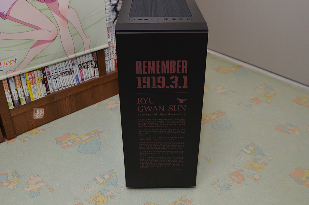 케이스는 박스 내부에 아주 안전하게 포장이 잘 되어 있었고, 삼일절 스페셜 에디션이다 보니 컴퓨터 본체 케이스 전면에는 'REMEMBER 1919. 3.1'이라는 문구와 함께 유관순 열사에 대한 역사가 짧게 프린팅되어 있었다. 크게 컴퓨터 케이스의 디자인을 해치지 않는 선에서 아주 깔끔하게 잘 프린팅이 되어 있다고 생각한다.