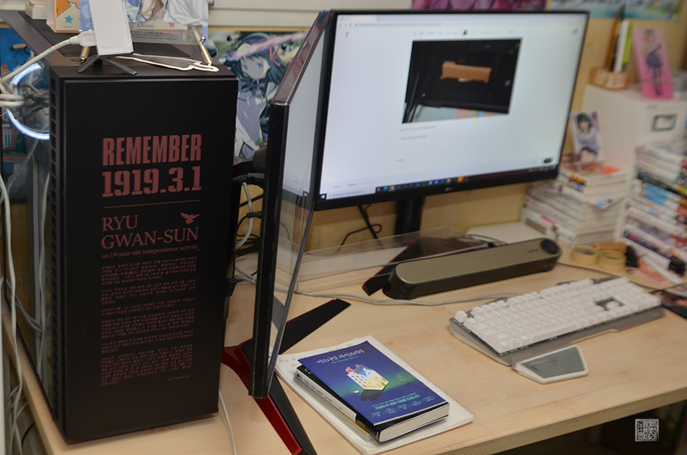 깔끔하게 화이트 조명이 잘 들어오는 데다가 미들타워 케이스이다 보니 그렇게 많은 자리를 차지 하지 않았다. 다만, 이렇게 사진을 찍어 놓고 본다면… 역시 책상이 32인치 모니터 두 개에 컴퓨터 본체와 여러 책을 쌓아두고 지내기에는 다소 비좁다는 느낌이 강했다. 아무래도 다음에는 1800X700 책상을 새롭게 주문해야 할 것 같다.