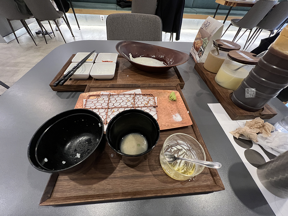 하지만 서면 기리는 돈가스를 미리 만들어 1차 튀긴 상태로 보관을 했다가 재차 튀겨서(혹은 데우거나) 나오는 게 아니라 주문이 들어오면 그때부터 고기에 빵가루를 입히거나 다른 조리 과정을 거치기 때문에 돈가스가 나오는 데에 조금 시간이 걸릴 수밖에 없다. 그동안 물만 마시며 기다리기는 조금 그래서 샐러드를 무심코 먹게 된다.