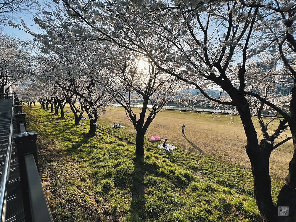벚나무 아래에서 삼삼오오로 시간을 보내고 있는 사람들의 모습은 그림 같은 풍경을 자아냈다. 거기에 자연스럽게 거리두기(?)를 하고 있는 것처럼 일정한 간격으로 떨어져 있는 벚나무들이 기울고 있는 해의 빛을 받아 보여주는 모습은 누구나 다 무심코 스마트폰을 꺼내서 사진 한 장을 찍게 하는 놀라운 매력이 있었다고 생각한다.