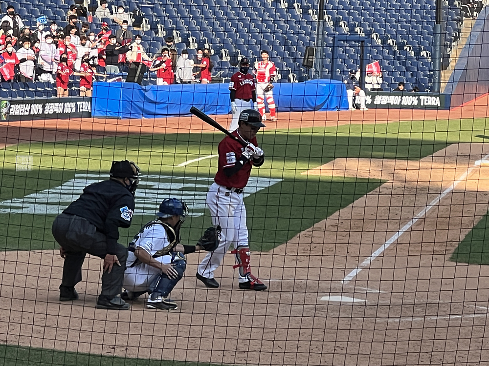 아마 이건 사람의 성향이라고 생각하는데… 현재 모든 야구장에서 마스크 착용을 빼고 규제가 다 풀린 상태이기 때문에 좌석에 앉아서 음식을 먹을 수 있다는 건 팩트이니 오해하지 말자. 당시 내가 피자를 급히 먹고 나서 박스를 버린 이후 본격적으로 야구가 시작했을 때 앞에 앉은 다른 커플은 닭강정을 사서 시합을 보며 열심히 먹었다.