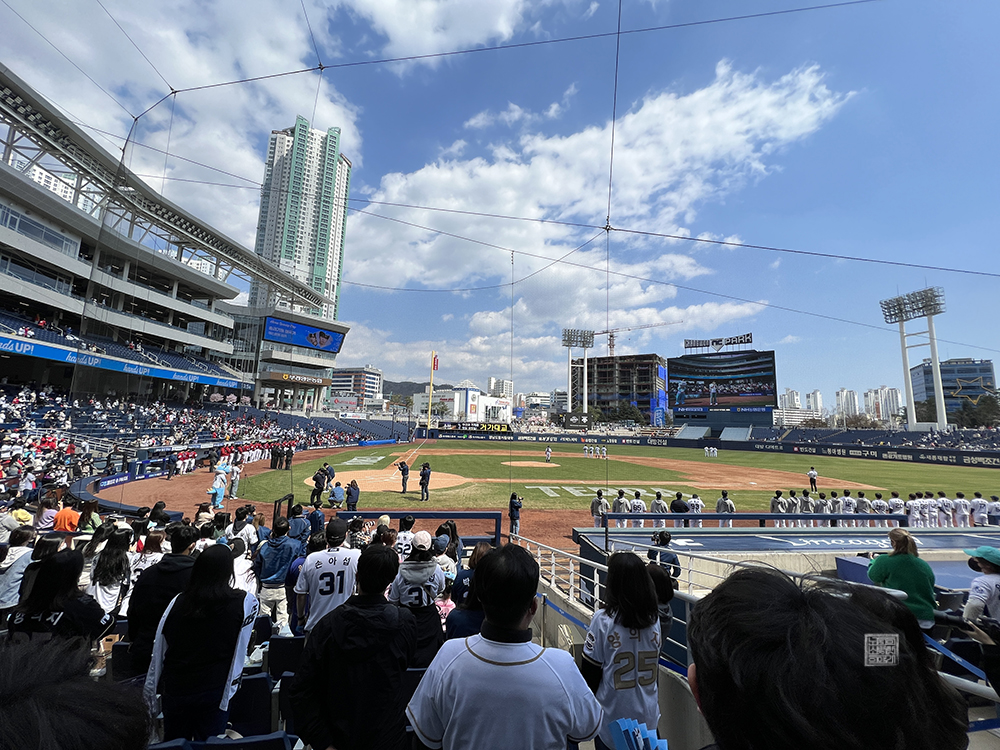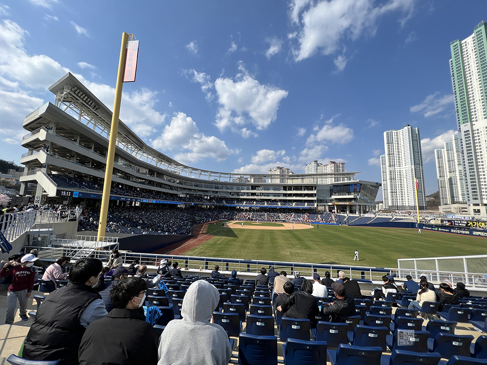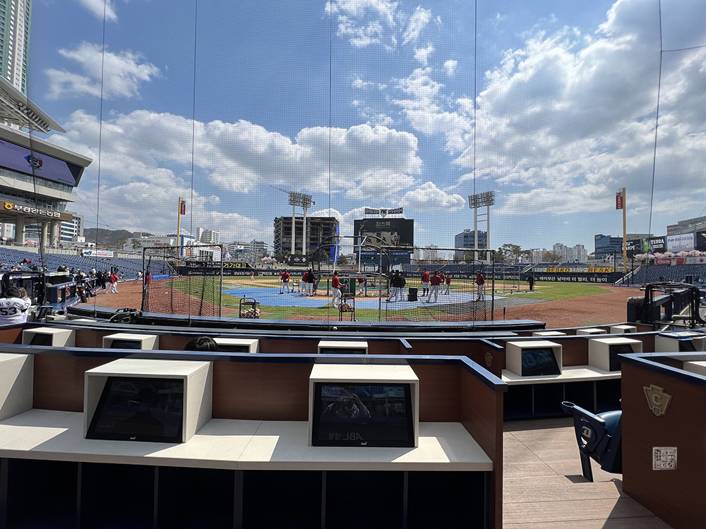 야구장 내부로 들어가니 SSG 랜더스 선수들이 몸을 푸는 모습을 볼 수 있었는데, 창원 NC 파크는 어디에 자리를 잡고 앉더라도 야구장을 한눈에 바라볼 수 있는 탁 트인 시야를 자랑하고 있기 때문에 어느 좌석에 앉더라도 야구를 실감나게 감상할 수 있다. 단, 특정 자리에 앉아야 치어리더와 선수들을 볼 수 있으니 참고하도록 하자.