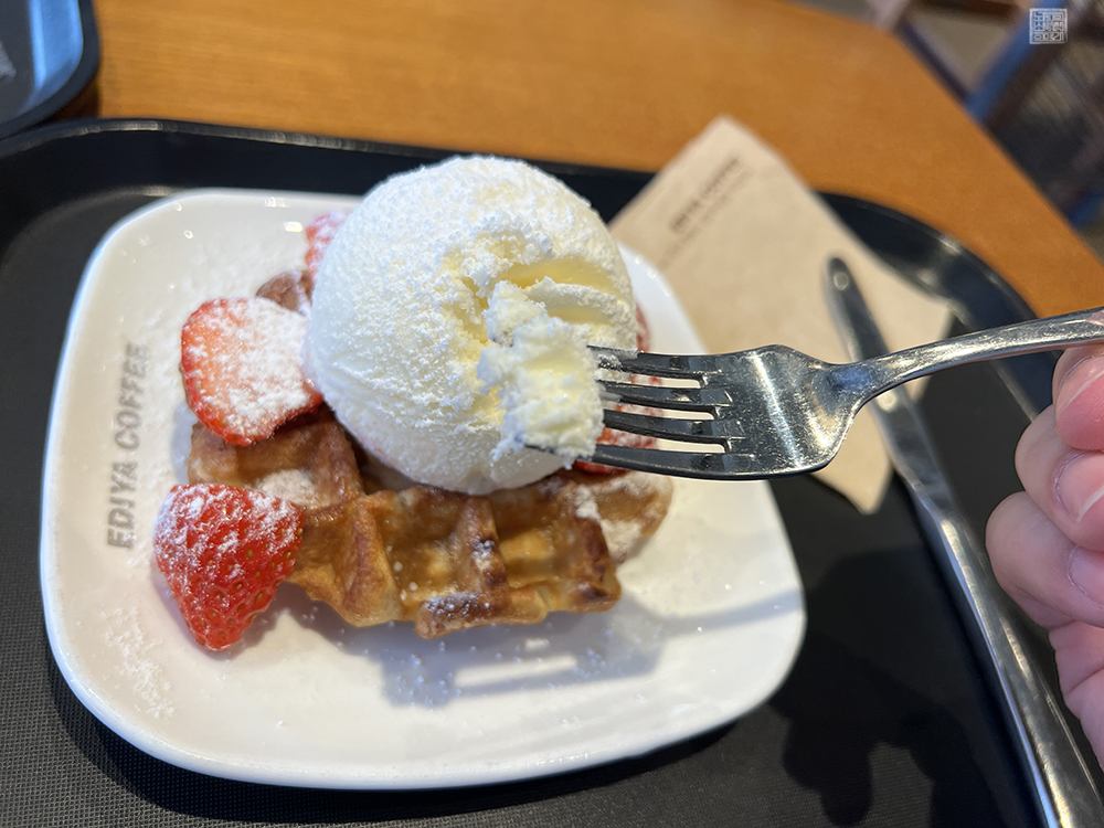 와플의 맛은 평범히 맛있게 먹을 수 있는 와플이었다고 생각한다. 이제 막 갓 구워서 혹은 마무리 작업을 해서 나온 따끈따끈한 와플이라 이건 맛이 없을 수가 없었다. 와플 위에 올려진 바닐라 아이스크림과 함께 와플을 함께 먹는 건 최고의 조합이 따로 없었는데, 이 조합을 최초로 생각한 사람은 과연 돈을 얼마나 벌었을지 궁금하다.