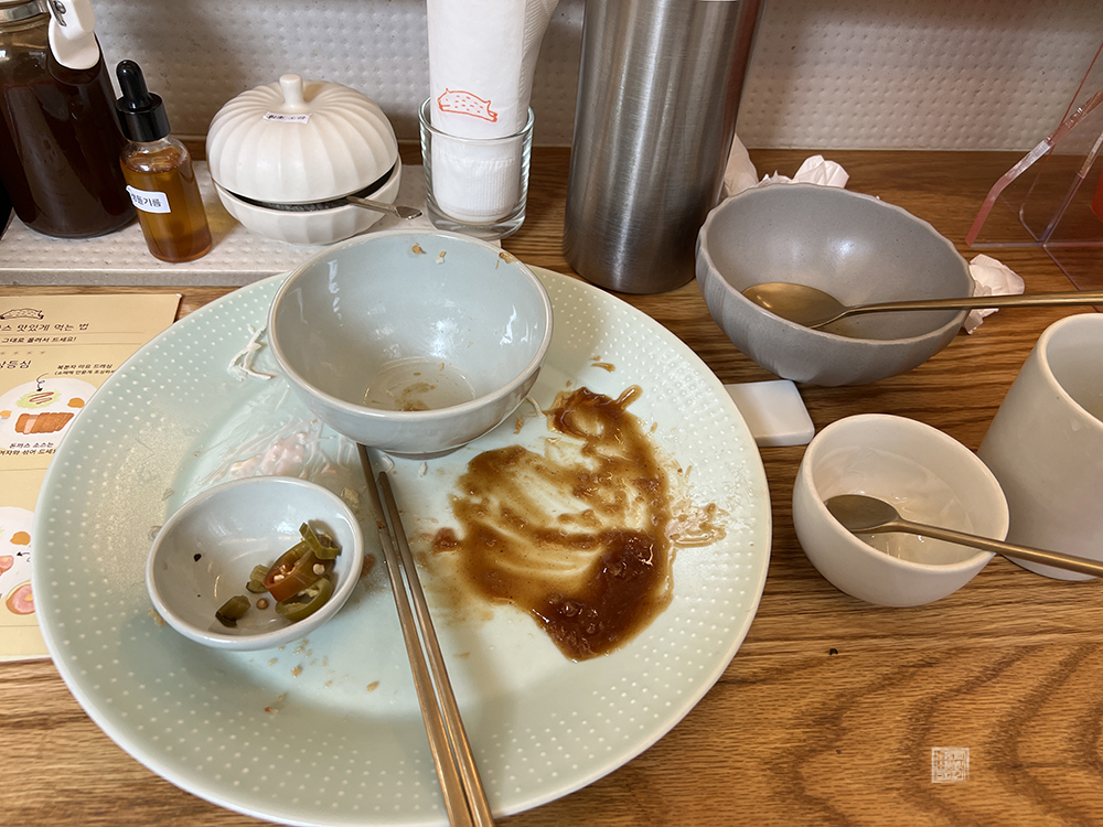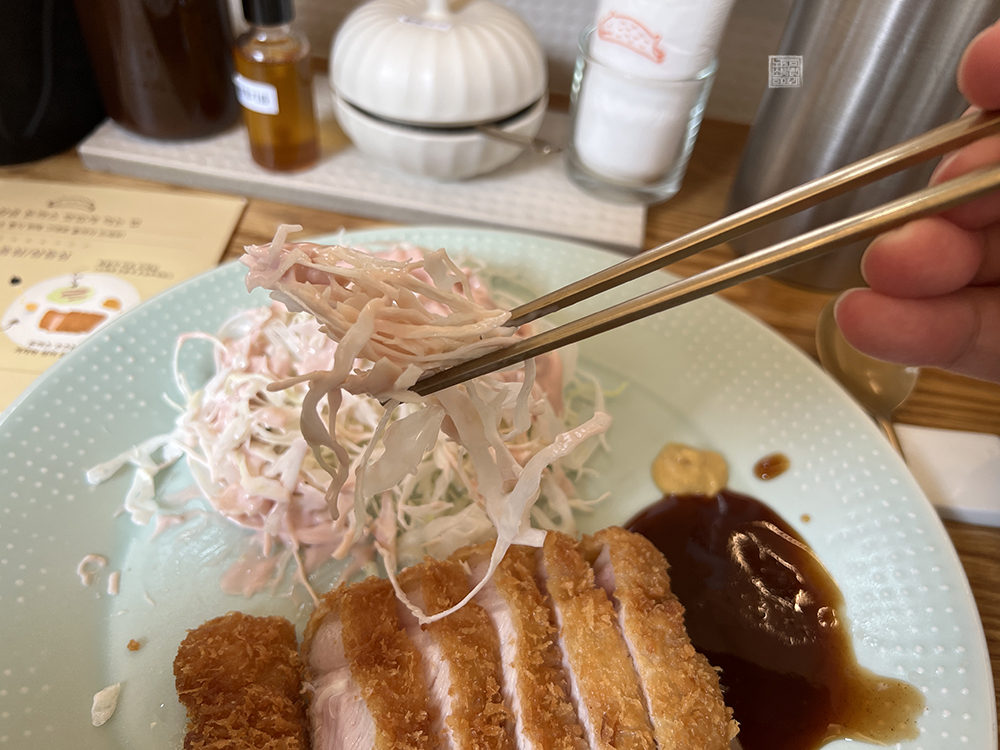 하지만 따로 공깃밥과 시래기 된장국, 간단한 밑반찬이 함께 나오기 때문에 평소 우리가 돈까스 전문점을 찾았을 때 받을 수 있는 밑반찬(?) 구성은 다 있다고 생각하면 된다. 어디까지 우리에게 중요한 건 돈까스이기 때문에 일단 돈까스를 먹는 데에 집중할 수 있는 형태의 그릇 구성이라 허전해 보여도 이게 썩 괜찮았다고 생각한다.