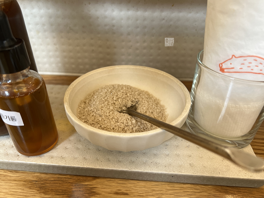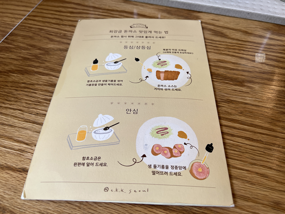 최강금 돈까스에 들어가서 테이블에 앉으면 앞에 소금을 비롯해서 돈까스 소스, 들기름이 들어가 있는 병 등이 놓여 있는 것을 알 수 있다. 처음에는 돈까스를 먹는 데에 왜 들기름이 있는지 이해할 수 없었는데, 최강금 돈까스에서는 맛있게 먹는 방법으로 들기름과 소금을 섞어서 만든 기름장에 돈까스를 찍어 먹는 것을 추천하고 있었다.