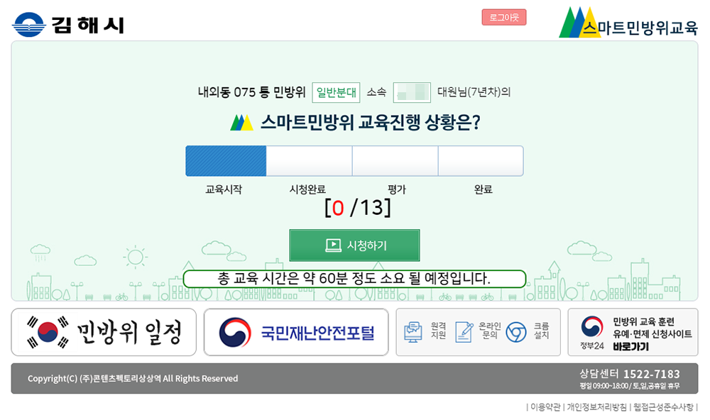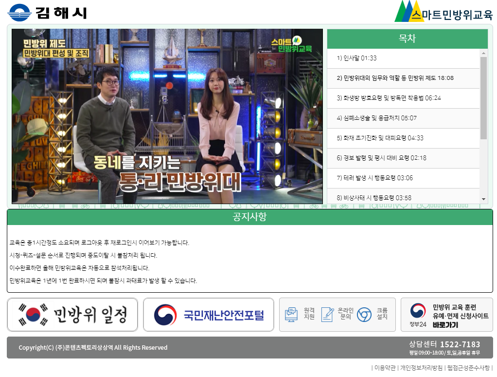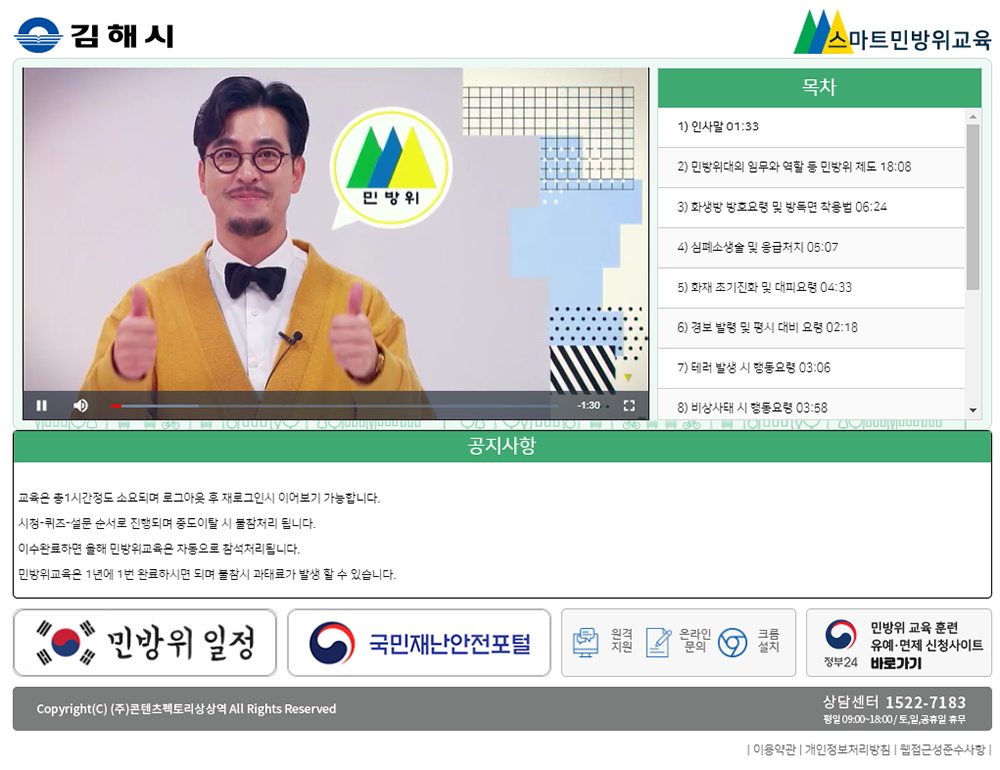 비밀번호를 입력하고 나면 이제 본격적으로 민방위 교육을 들을 수 있다. 자신의 연차에 따라서 4시간(1~2년차), 2시간(3~4년 차), 1시간(5년 차)으로 나누어지는데… 나는 벌써 7년 차에 해당하기 때문에 딱 1시간만 들으면 된다. 이 1시간 동안 들을 수 있는 민방위 교육은 사람들이 최대한 흥미를 가지고 볼 수 있도록 잘 만들어져 있었다고 생각한다.