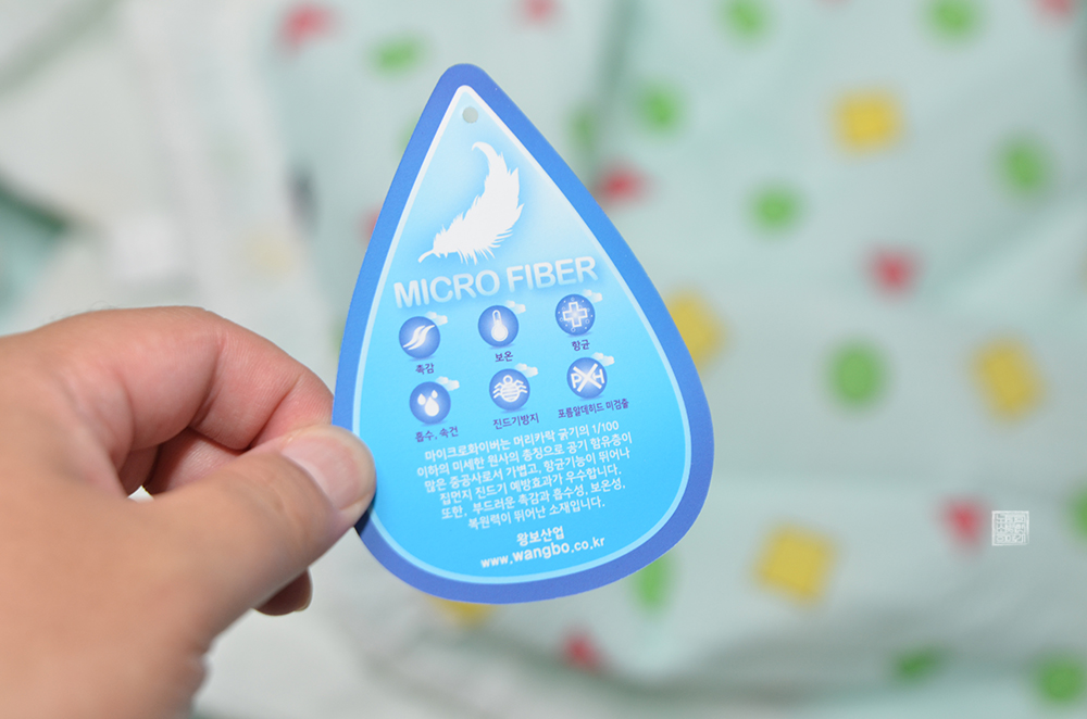 그리고 덮는 이불은 제조사의 설명에 따르면 홑겹이 아닌 얇은 마이크로 화이버 솜을 사용하고 있기 때문에 잦은 세탁에도 뭉치지 않을 뿐만 아니라 푹신함을 느낄 수 있다고 적혀 있다. 하지만 실제로 이불을 만져보았을 때의 느낌은 그렇게 막 푹신함을 느낄 수 있는 정도는 아니고, 그냥 적당히 부드러운 두께 정도로 솜이 있다는 느낌이 들었다.