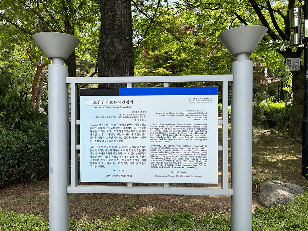 도산공원(도산근린공원)의 중앙에 자리 잡고 있는 도산 안창호 선생님의 동상 근처에는 동상 건립과 관련된 설명이 적힌 게시판과 함께 도산 안창호 선생님의 역사를 볼 수 있는 다양한 사진이 전시되어 있었다. 이때부터 나는 가볍게 쉬려고 들어온 마음이 아니라 조금이나마 경건한 마음을 품은 채로 천천히 공원을 둘러보았다.