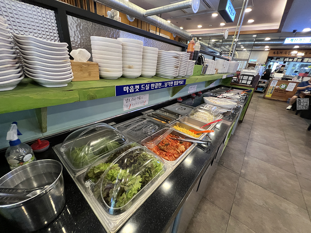 목촌 돼지국밥은 원래 국밥을 주문하면 기본적인 반찬을 국밥과 함께 받아볼 수 있었지만, 현재는 반찬을 셀프바에서 직접 가져와야 하는 형태로 바뀌었다. 셀프바를 본다면 떡볶이부터 시작해서 계란 프라이를 해 먹을 수 있을 뿐만 아니라 기본적인 밑반찬과 상추 등 다양한 반찬이 놓여 있어 국밥 외 다른 음식을 먹을 때도 이용하기가 좋았다.