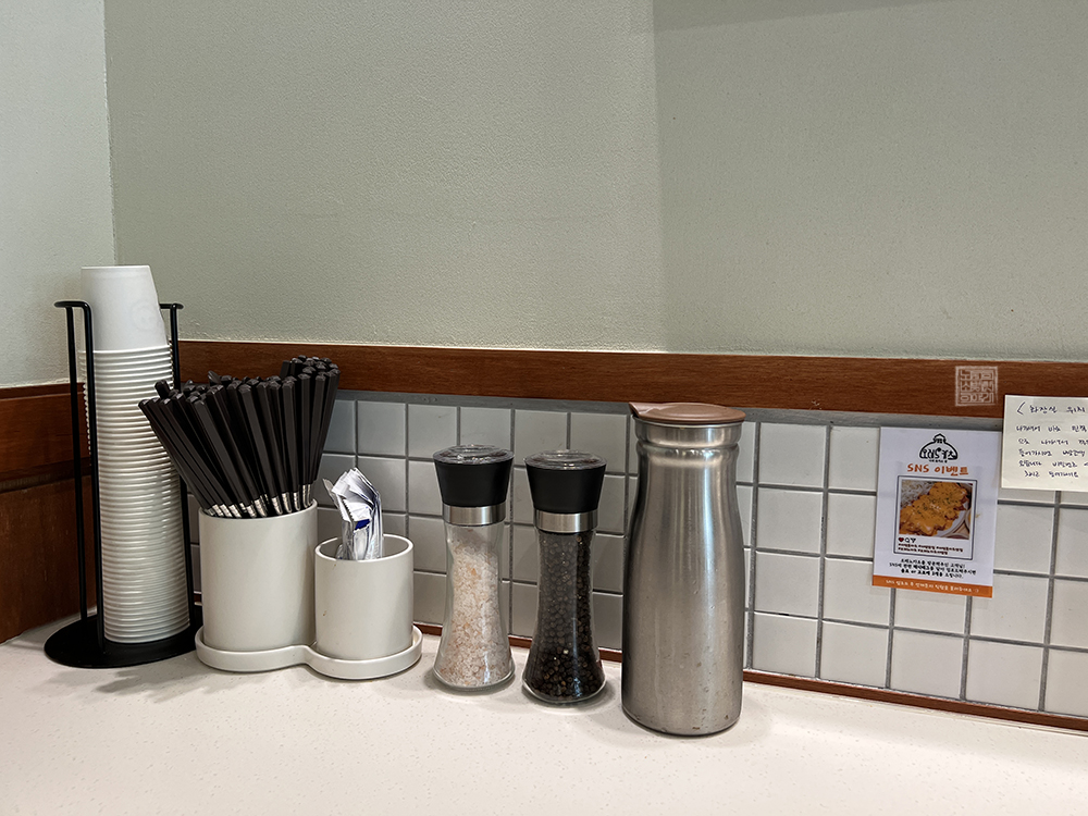 그런데 테이블을 본다면 돈가스를 소금에 찍어 먹을 수 있도록 소금이 준비되어 있었는데, 테이블 위나 돈가스를 받았을 때 소금을 따로 덜어먹을 수 있는 공간이 없었다. 당시에 나는 소스 접시를 하나 새로 달라고 해야 할지 고민하다가 단무지를 돈가스 접시로 옮긴 이후 단무지 접시에 소금을 갈아서 뿌린 이후 생돈카츠와 함께 먹었다.