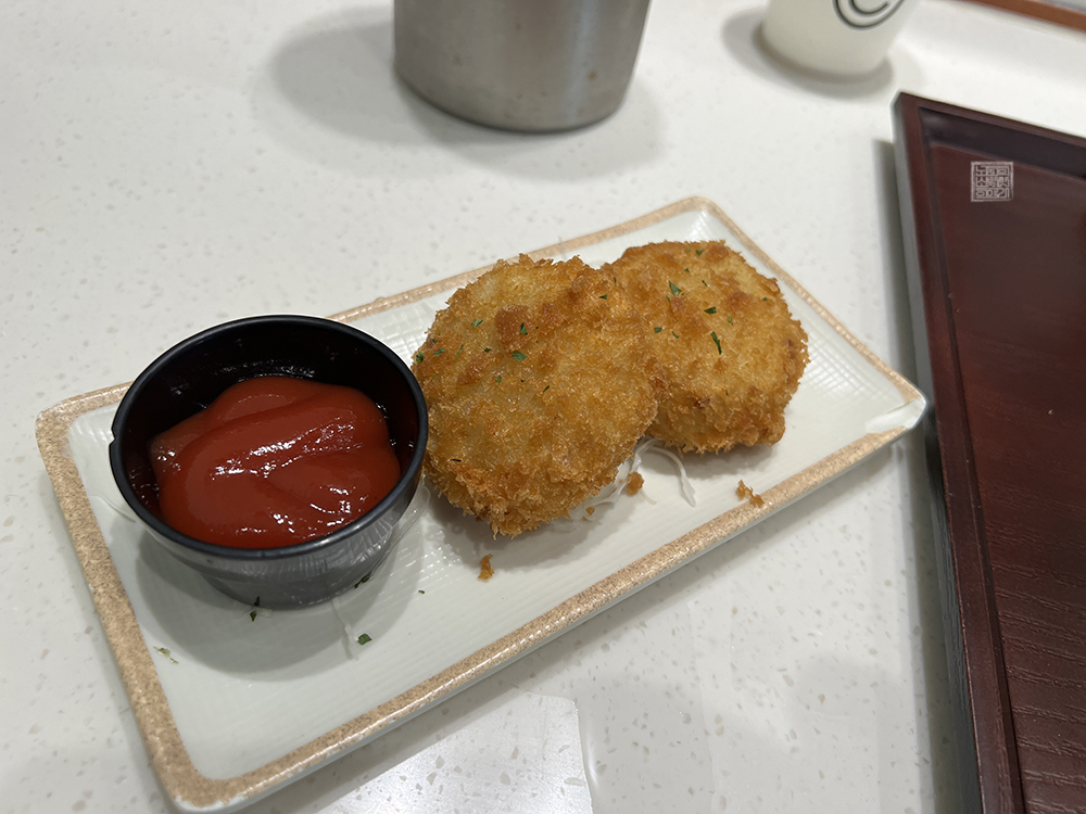 감자 고로케도 역시 안과 밖에 겉바속촉하게 잘 익어서 맛있게 먹을 수 있었는데, 한 가지 아쉬운 점이 있다고 한다면 케첩이 담긴 종지 종지 그릇이 한 입 베어 먹기 전의 감자 고로케를 젓가락으로 들고 찍어 먹기 쉽지 않았다는 점이다. 그냥 좀 넓적한 느낌의 작은 종지 그릇이었다면 케첩을 찍어 먹기가 편했을 것 같아 그게 좀 아쉬웠다.
