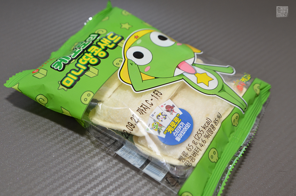 이번에 내가 구매할 수 있었던 케로로빵은 케로로의 미니 땅콩샌드로, 겉모습은 포켓몬빵에서 볼 수 있는 피카피카 달콤 앙버터샌드와 닮아 있지만 그 속은 전혀 다른 빵이다. 이미 이름을 본다면 피카피카 달콤 앙버터샌드는 팥과 버터가 들어가 있는 빵이고, 케로로의 미니 땅콩샌드는 이름 그대로 땅콩 크림이 들어가 있는 빵이다.