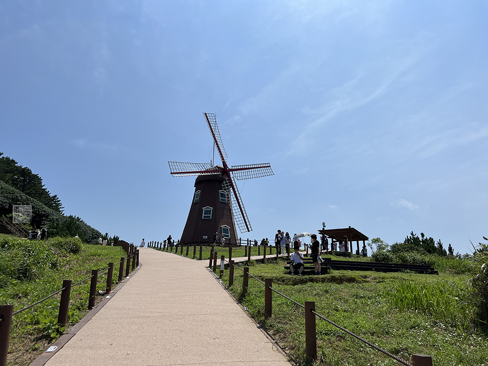 거제도 바람의 언덕의 상징 중 하나는 바로 위 사진에서 볼 수 있는 풍차다. 이 풍차는 도장포 마을 주차장에서 올라온다면 정면에서 곧바로 모습을 볼 수 있어 사진을 찍기가 편리하지만, 도장포에서 내려오는 형태로 바람의 언덕을 온다면 풍차의 후면을 바라보는 형태로 길이 있기 때문에 처음부터 정면을 배경으로 사진을 찍을 수가 없다.