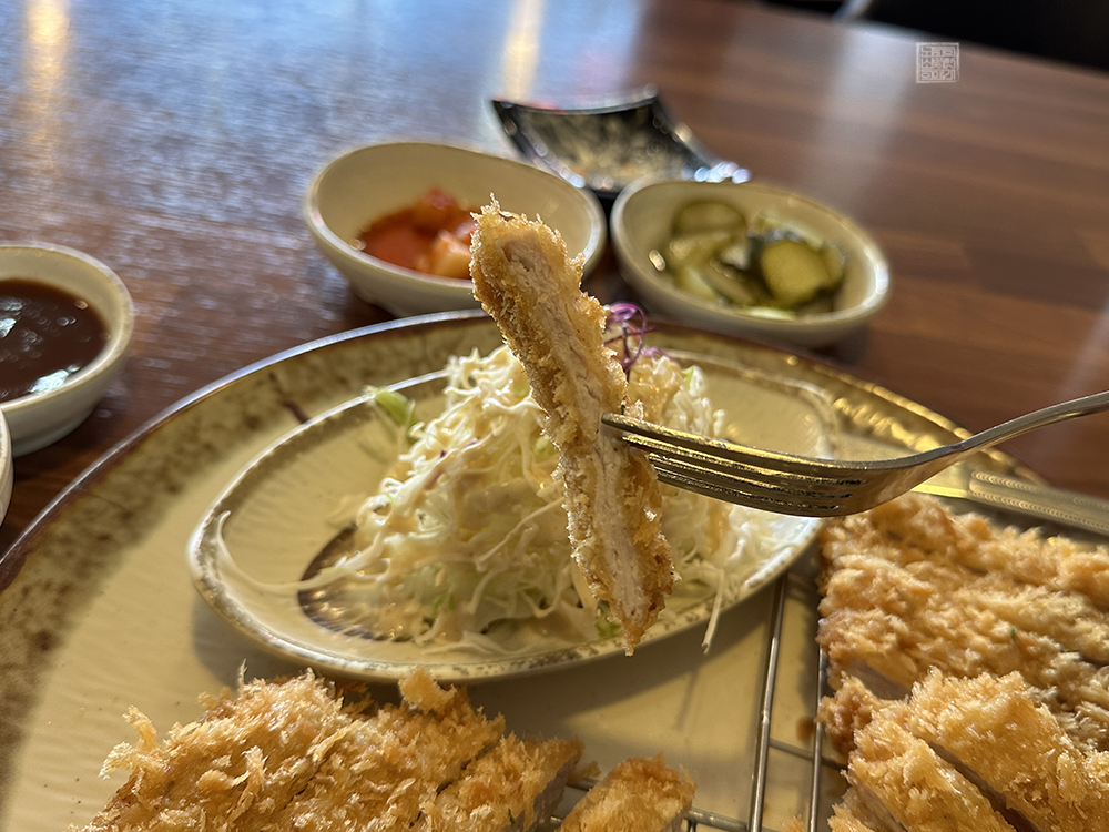 그리고 로스까스도 겉바속촉이 완벽한 상태로 나왔기 때문에 돈까스를 한 입 베어 먹을 때마다 '오우, 맛있다!'라며 저절로 행복한 미소가 지어졌다. 역시 가을을 맞아 짧게 운동을 한 이후 먹는 돈까스는 이렇게 맛있을 수가 없다. 돈까스를 소스에 찍어 먹으면서 열심히 공략하다 보니 밥 한 그릇과 함께 로스까스가 금새 동이 나고 말았다.