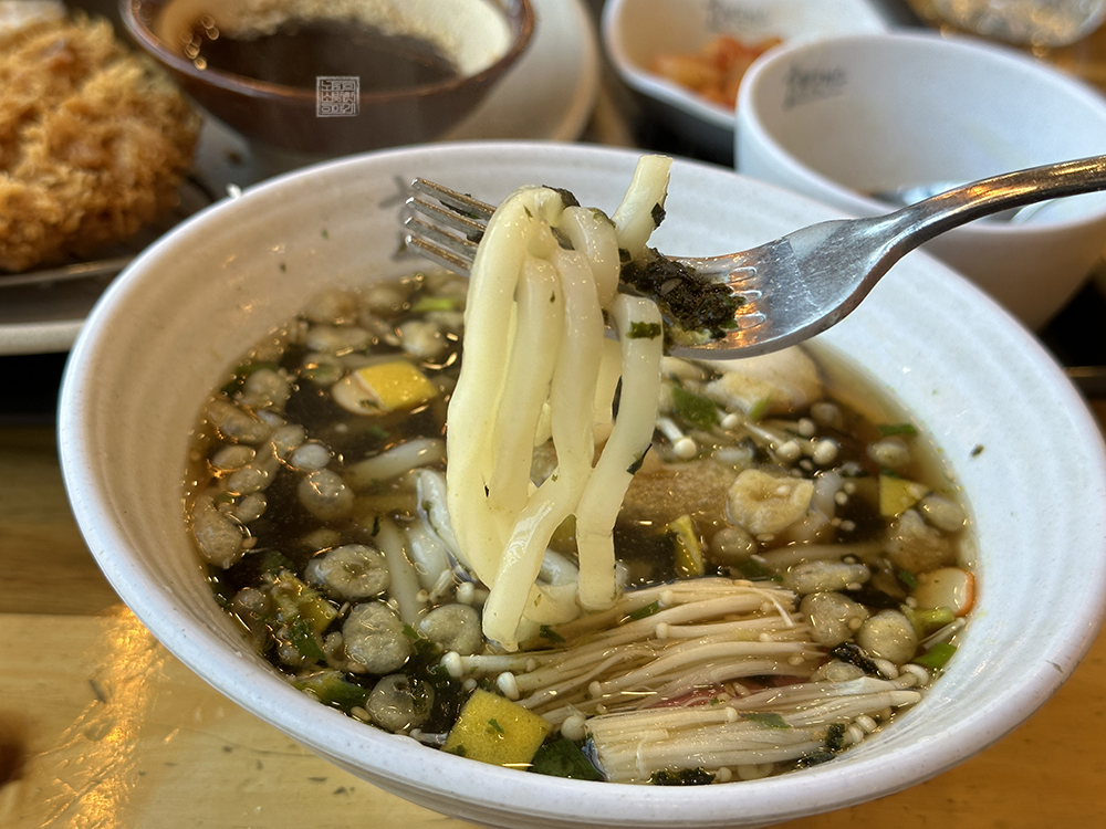 중요한 건 우동의 맛인데… 맛도 굳이 지적할 필요 없이 진한 국물과 함께 맛있게 우동 면사리를 먹을 수 있었다. 로스까스를 밥과 함께 2~3조각 먹은 이후 면이 불기 전에 우동을 국물과 함께 먼저 먹었는데, 우동만 먹어도 슬슬 배가 불러올 정도로 양이 적지 않았다. 우동을 좋아하는 사람이라면 우동만 주문해서 먹어도 충분할 듯했다.