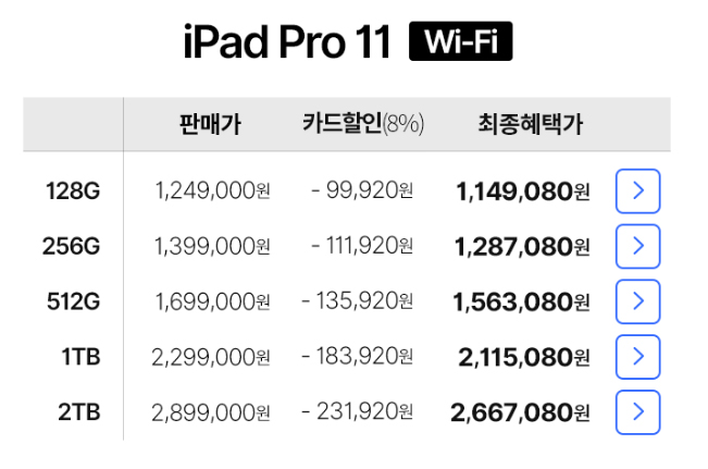 아이패드 프로를 진짜 필요로 하는 사람들은 전문적인 작업에 이용하는 경우가 많다 보니 사실 128GB 용량으로 터무니없다는 인식이 강하다. 덕분에 현재 쿠팡 사전 예약 물량을 본다면 아이패드 프로는 1TB wifi 셀룰러 모델이 가장 빠르게 품절이 되었고, 1TB가 부담스러운 사람들이 있다 보니 512GB Wifi 셀룰러 모델이 품절되었다.