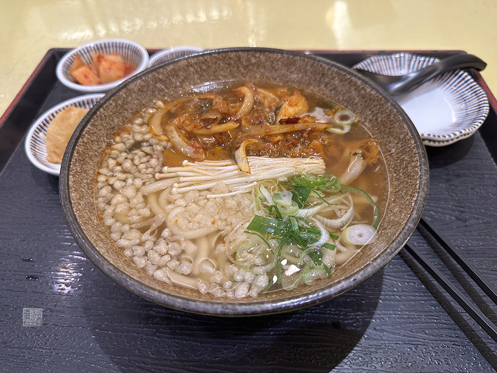 우동 메뉴도 정식과 단품이 있었는데, 우동 메뉴를 정식으로 주문할 경우 안심카츠+유부초밥+연두부+샐러드가 포함되어 나온다고 한다. 하지만 단품 같은 경우에는 안심카츠와 연두부, 샐러드 없이 위 사진에서 볼 수 있는 김치우동을 메인으로 해서 유부초밥 한 조각과 함께 단무지와 깎두기 등 밑반찬도 나왔기 때문에 부족함은 없었다.