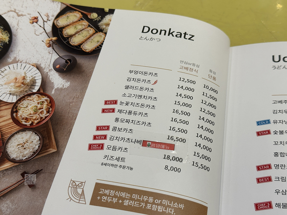 부엉이 돈가스는 모든 메뉴가 '고베 정식'과 '단품'으로 이루어져 있는데, 고베 정식을 선택한다면 미니 우동 또는 미니 소바 둘 중 하나를 선택해서 연두부와 샐러드 메뉴와 함께 받아볼 수 있다. 그냥 단품을 먹어도 되겠지만 나는 고베의 맛을 제대로 느껴보고 싶어 부엉이 돈카츠 정식을, 어머니는 김치우동 단품으로 메뉴를 주문했다.