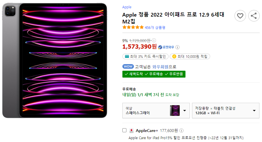 아이패드 프로 12.9 6세대 M2 칩 모델의 가격을 본다면 쿠팡 로켓 와우 회원 할인 9%를 받아서 약 157만 원에 구매할 수 있다. 원가가 약 172만 원인 걸 생각한다면 약 25만 원 정도가 저렴한 가격이다 보니 역시 쿠팡에서 구매하는 게 이득이다. 여기서 놀라운 건 노트북인 맥북 프로와 태블릿 PC인 아이패드 프로의 가격이 비슷하다는 점이다.